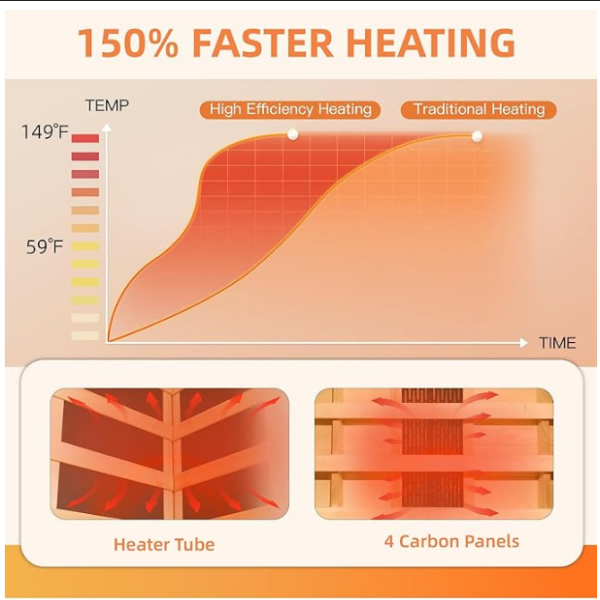 【Tecnologia di riscaldamento efficiente】 dotato di 4 pannelli di carbonio e 1 tubo di carbonio, la nostra sauna a infrarossi a 1 persona fornisce riscaldamento surround a 360 gradi, garantendo una distribuzione uniforme del calore. In genere, si riscalda in soli 10-15 minuti, permettendoti di goderti senza indugio la tua esperienza di sauna.