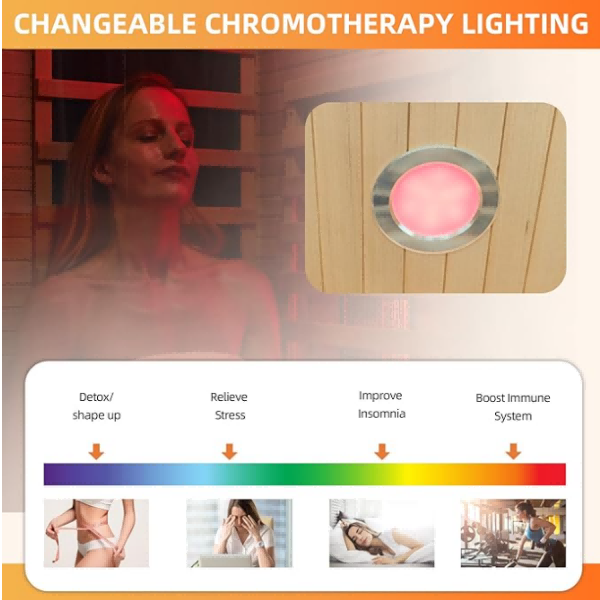 【Rilassamento migliorato】 Le nostre saune a infrarossi per la casa presentano un tetto illuminato con terapia a 7 a colori, creando un'atmosfera immersiva per migliorare la tua esperienza complessiva. È facilmente instabile nel tuo seminterrato, bagno o palestra e con connettività Bluetooth e una barra di ossigeno, puoi goderti una rilassante sessione di sauna