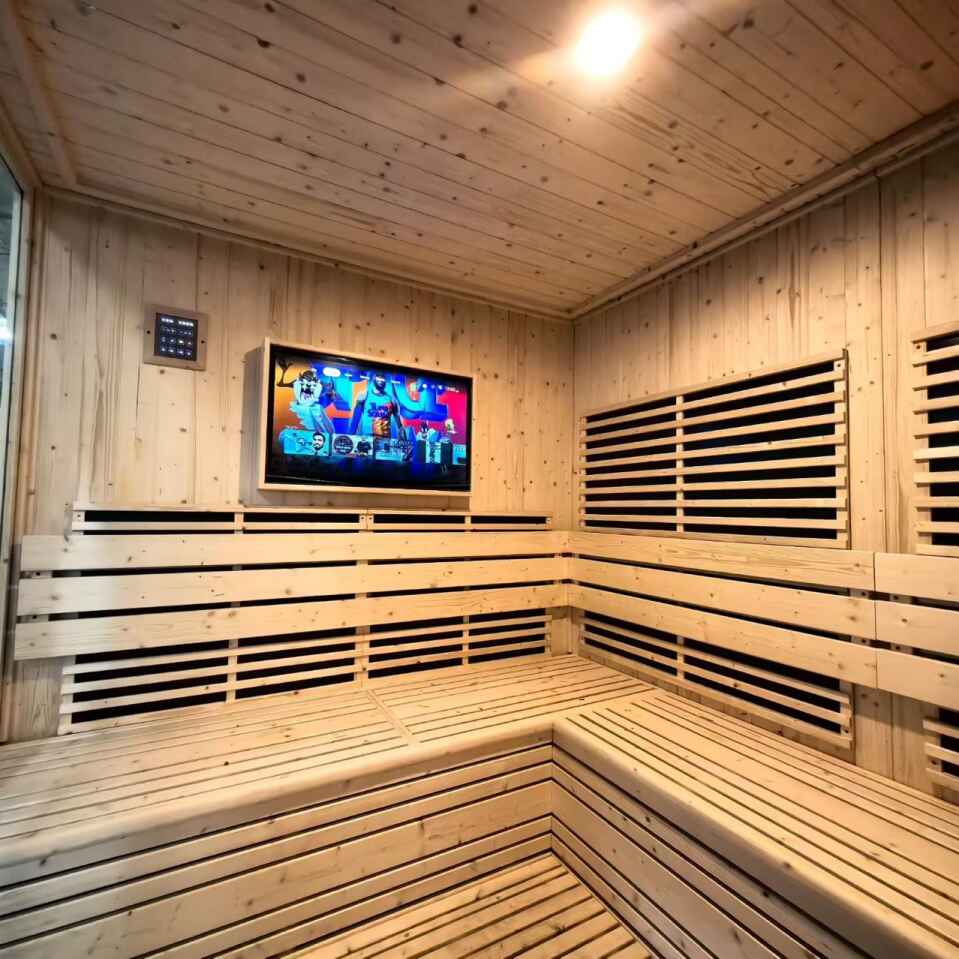 Il TV LCD integrato (visibile nell'immagine) trasforma l'esperienza della sauna: