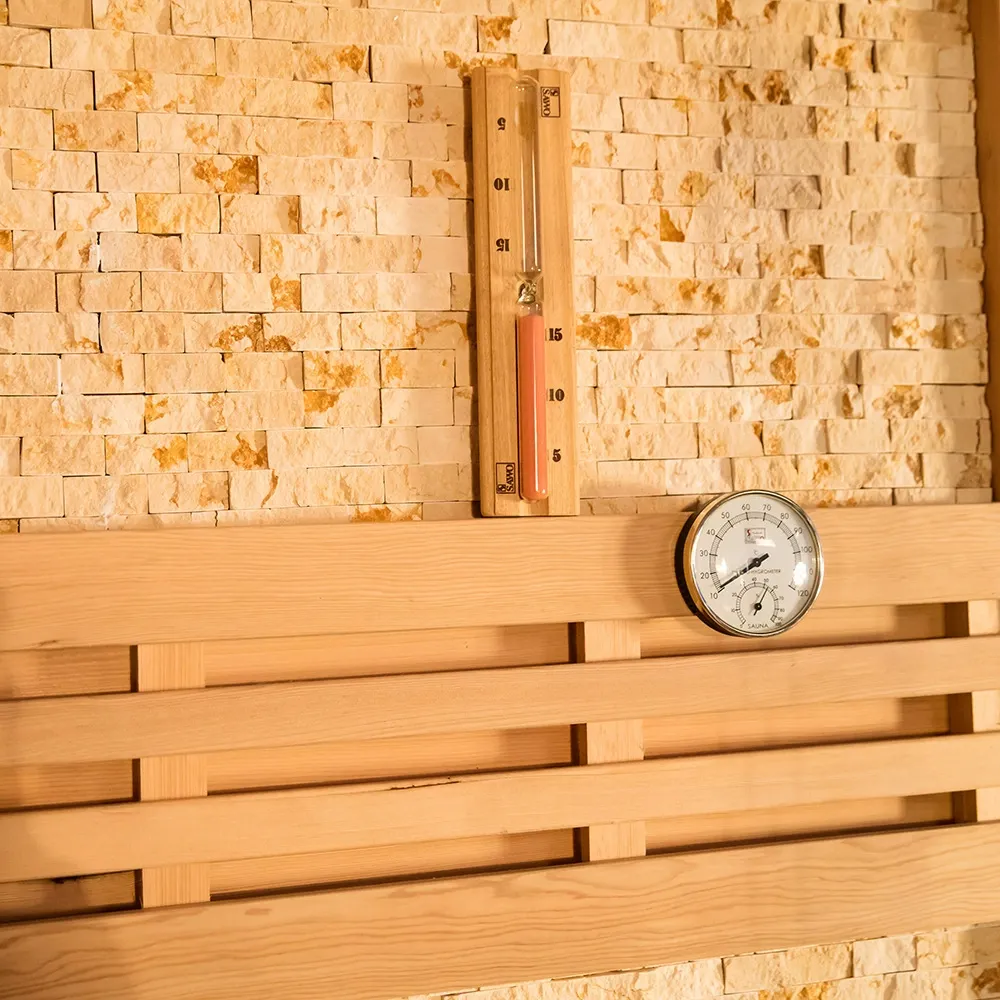 - Sensore di temperatura: integrato nella parete laterale della sauna per rilevare con precisione le variazioni di temperatura nelle diverse aree, garantendo un riscaldamento uniforme.