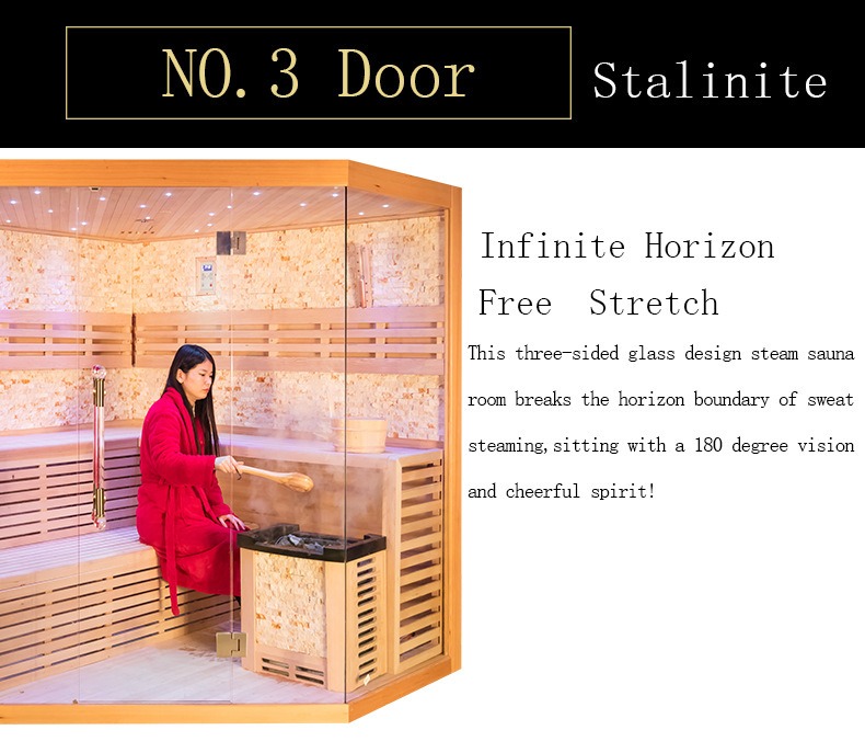 Caratterizzato da una struttura innovativa della porta in vetro speciale Stalinite su tre lati, questo vetro è sottoposto a uno speciale trattamento di tempra ad alta temperatura, offrendo un'eccezionale resistenza al calore e agli urti. Mantiene la stabilità anche a temperature superiori a 70℃ all'interno della sauna, con altissima trasparenza e nessuna distorsione ottica. Il design in vetro su tre lati garantisce un'ampia visuale a 180 gradi senza ostacoli, rompendo completamente la sensazione angusta e chiusa delle saune tradizionali. Gli utenti possono mantenere il contatto visivo con l'ambiente esterno mentre si godono la sauna, rendendola ideale per balconi domestici, cortili e altri scenari, consentendo di apprezzare lo scenario esterno mentre si sperimenta la terapia del calore per una mente e un corpo più rilassati e confortevoli. Inoltre, il sistema Starlight Ambiance integrato internamente crea un effetto stella scintillante attraverso strisce luminose a LED nascoste sulle pareti superiore e laterale. La luce soffusa si integra con il vapore caldo, alleviando efficacemente l'affaticamento degli occhi e favorendo un'atmosfera di sauna coinvolgente e piacevole.