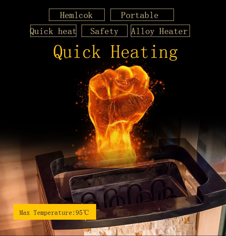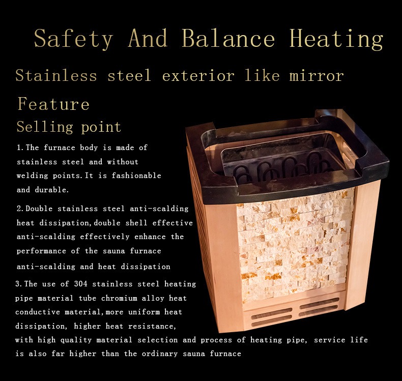 Inoltre, il riscaldatore per sauna è dotato di un dispositivo di protezione dal surriscaldamento che si spegne automaticamente quando la temperatura supera la soglia di sicurezza, garantendo la doppia efficienza del riscaldamento e la sicurezza dell'utente.