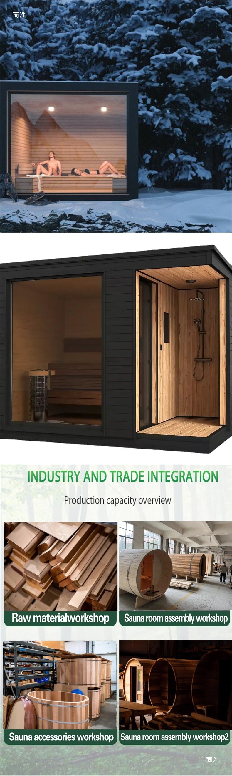 - Il guscio esterno nero intenso o grigio antracite è dotato di un rivestimento anticorrosione professionale, resistente alla pioggia, al sole e alle condizioni esterne difficili, perfetto per cortili, campeggi, laghi e altro ancora. Le eleganti linee minimaliste abbinate a finestre dal pavimento al soffitto quasi a tutta parete garantiscono la privacy durante le sessioni di sauna, mostrando senza ostacoli viste su laghi, montagne e foreste, trasformando la natura in uno sfondo integrato per il tuo relax.