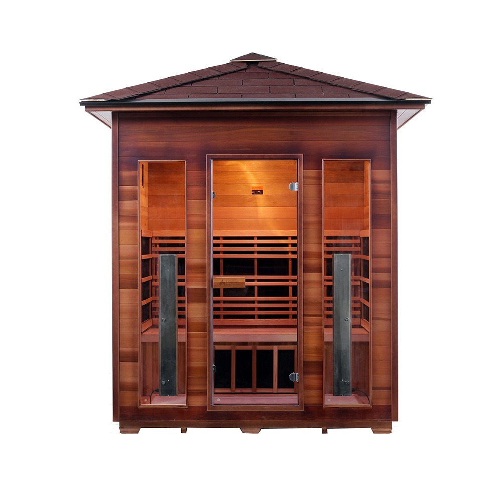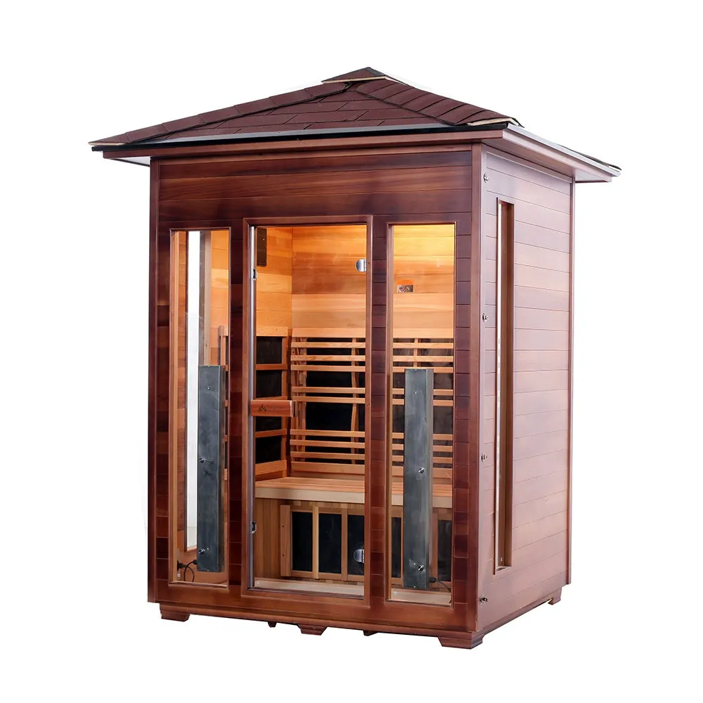 Questa sauna all'aperto è realizzata in cedro rosso occidentale canadese o cicuta canadese. Il legno vanta resistenza alla corrosione e all'umidità, nonché stabilità strutturale. Dotato di tecnologia di riscaldamento in fibra di carbonio a infrarossi lontani, si riscalda rapidamente e distribuisce il calore in modo uniforme. Adatto per ambienti esterni come cortili, balconi, giardini di ville, aree bordo piscina e resort.